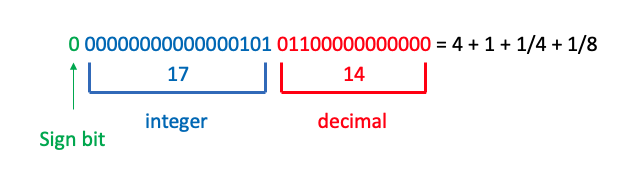 고정 소수점 연산은 위의 그림과 같이 총 32비트의 정수형 자료형에 뒤의 14비트는 소수 부분, 그 다음 17비트는 정수 부분, 마지막 1비트는 값의 부호를 나타내는 방식이다.