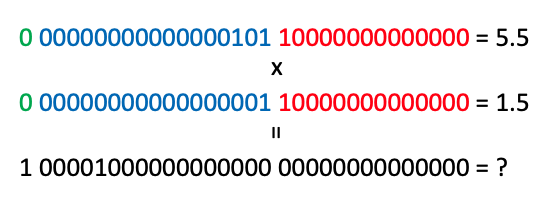 위와 같이 고정 소수점으로 나타낸 5.5와 1.5를 곱하면 아래의 결과를 얻을 수 있다. 이 값을 그대로 사용하면 우리가 기대하는 값과 아주 다른 값이 나오게 된다.